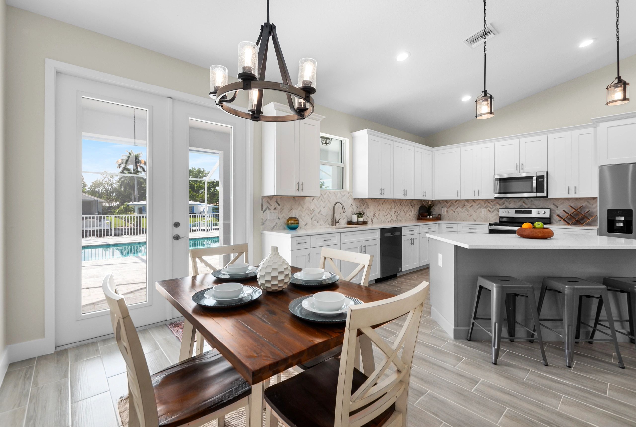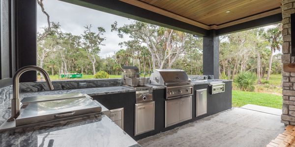 This custom-built outdoor kitchen is a masterpiece of design and functionality, crafted for the discerning homeowner. Featuring premium stainless steel appliances, including a built-in grill, refrigerator, and sink, this space is perfect for year-round entertaining.